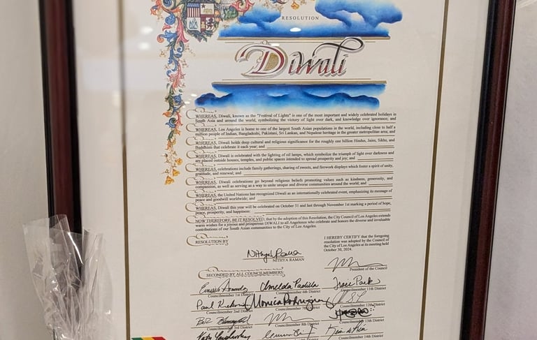 Given our community's substantial contributions to the social, cultural, and economic fabric of Los Angeles, it is both fitting and timely that we advocate for Diwali to be recognized as an official holiday in our city.
